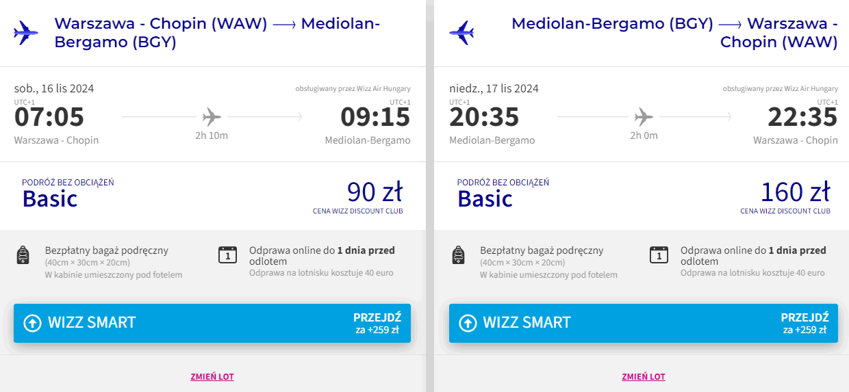 Do Bergamo wylecisz w sobotę (16 listopada) o godzinie 7:05 z warszawskiego lotniska im. Fryderyka Chopina. Do stolicy Polski wrócisz w niedzielę (17 listopada), a wylot zaplanowany jest na godzinę 20:35. W obie strony polecisz linią Wizz Air z wliczonym bagażem podręcznym. Bilety w najniższej cenie dostępne są dla członków Wizz Discount Club. Chętni na loty bez WDC zapłacą więcej.