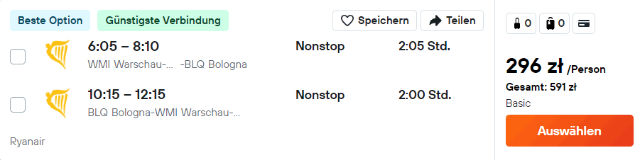 Do Bolonii wylecisz w sobotę (19 października) z warszawskiego lotniska w Modlinie o 6:05. W drogę powrotną do Polski wyruszysz w niedzielę (20 października), a wylot zaplanowany jest na godzinę 10:15. W obie strony podróżować będziesz linią Ryanair z wliczonym w cenę biletu bagażem podręcznym.
