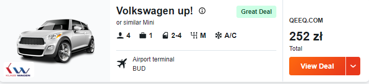 W zwiedzaniu Węgier pomoże wam wypożyczone auto. Za wynajem Volkswagena up! zapłacicie 252 PLN/2 osoby.