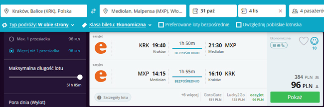 Uwaga! Im więcej ludzi podróżuje tym bilety będą tańsze. Podane ceny są dla 4 osób.
