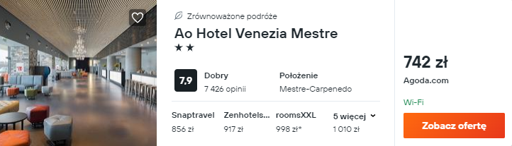 Wybrałem dla was noclegi w Mestre – znajdującej się na stałym lądzie części Wenecji. Zatrzymajcie się tam w bardzo dobrze ocenianym hotelu znanej sieci Ao Hotel Venezia Mestre.
