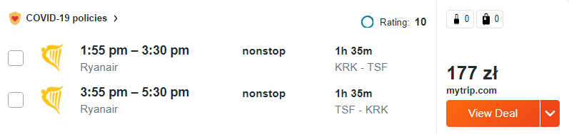 Na wczasy do Włoch polecicie z krakowskiego lotniska w gorącym, wakacyjnym terminie: https://www.kayak.com/in?a=fly4free&url=/flights/KRK-TSF/2021-06-30/2021-07-07/2adults?sort=bestflight_a&encoder=27_1&enc_pid=deeplinks&enc_eid=0&enc_lid=f_TSF_jan10&enc_cid=sample&utm_source=fly4free&utm_medium=affiliate&utm_term=rev&utm_campaign=deeplinks&utm_content=f_TSF_jan10. Czeka was bezpośredni loty realizowany na pokładzie samolotu linii lotniczej Ryanair, którego rozkładowy czas zaplanowano na 1h 35min.