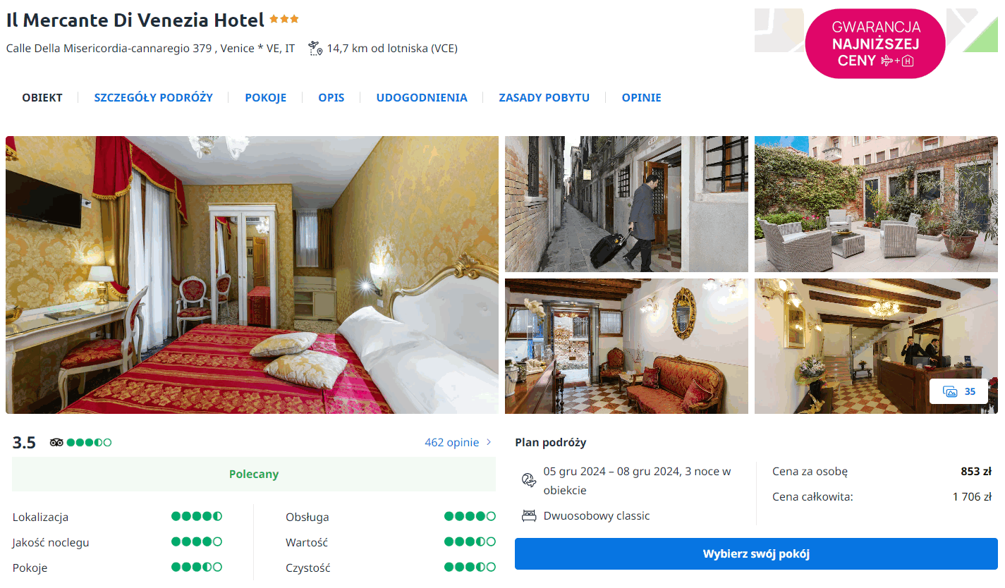 W Wenecji zatrzymasz się w bardzo dobrym 3* hotelu Il Mercante Di Venezia, który znajduje się 100 metrów od dworca kolejowego Santa Lucia. Każdy pokój wyposażony jest w klimatyzację z funkcją ogrzewania, telewizor LCD oraz czajnik elektryczny. W cenie zapewnione będziesz miał codzienne śniadania oraz dostęp do sieci WiFi.