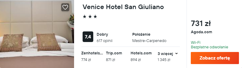 Wybrałem dla was noclegi w Mestre, czyli części Wenecji pozostającej na stałym lądzie. Czeka tam 3* hotel Venice San Giuliano. Będzie to korzystna baza wypadowa do odkrywania uroków zabytkowego starego miasta, a następnie dobre miejsce na wypoczynek po dniu pełnym atrakcji.