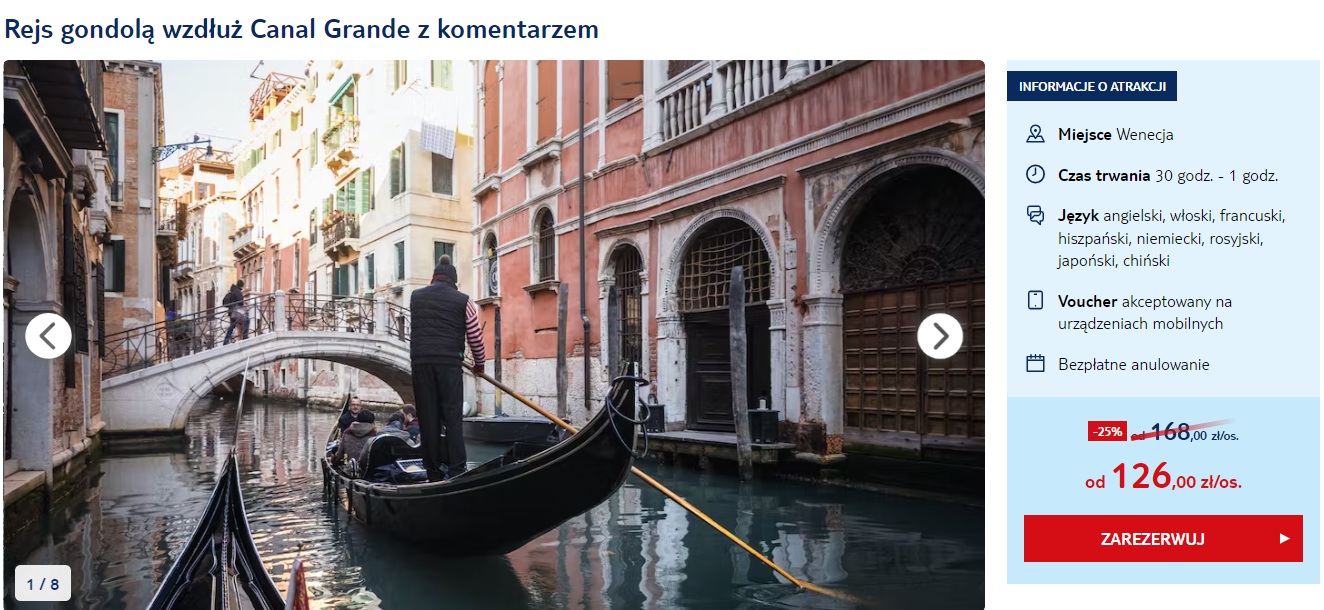 Będąc w Wenecji i nie przepłynąć się gondolą, tuż to grzech. Skorzystajcie z atrakcyjnej ceny i cieszcie się z rejsu wzdłuż Canal Grande.