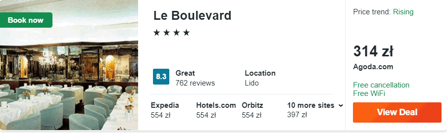 W Wenecji zakwaterowani będziecie w 4* hotelu Le Boulevard, który znajduje się nieopodal plaży na wyspie Lido. Z lotniska Treviso w okolice miejsca noclegowego dostaniecie się komunikacją publiczną za ok. 50 PLN.