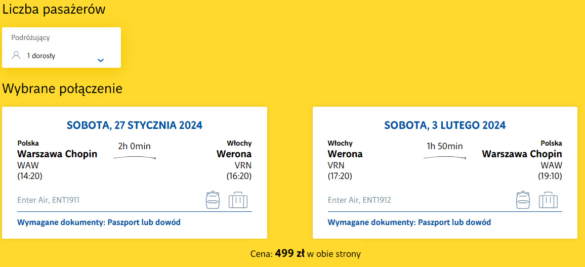 Podróż do Włoch odbędzie się już niebawem, w terminie 27 stycznia – 3 lutego. Do Werony polecisz bezpośrednio z Warszawy, korzystając z połączenia realizowanego na pokładzie samolotu linii lotniczej Enter Air.