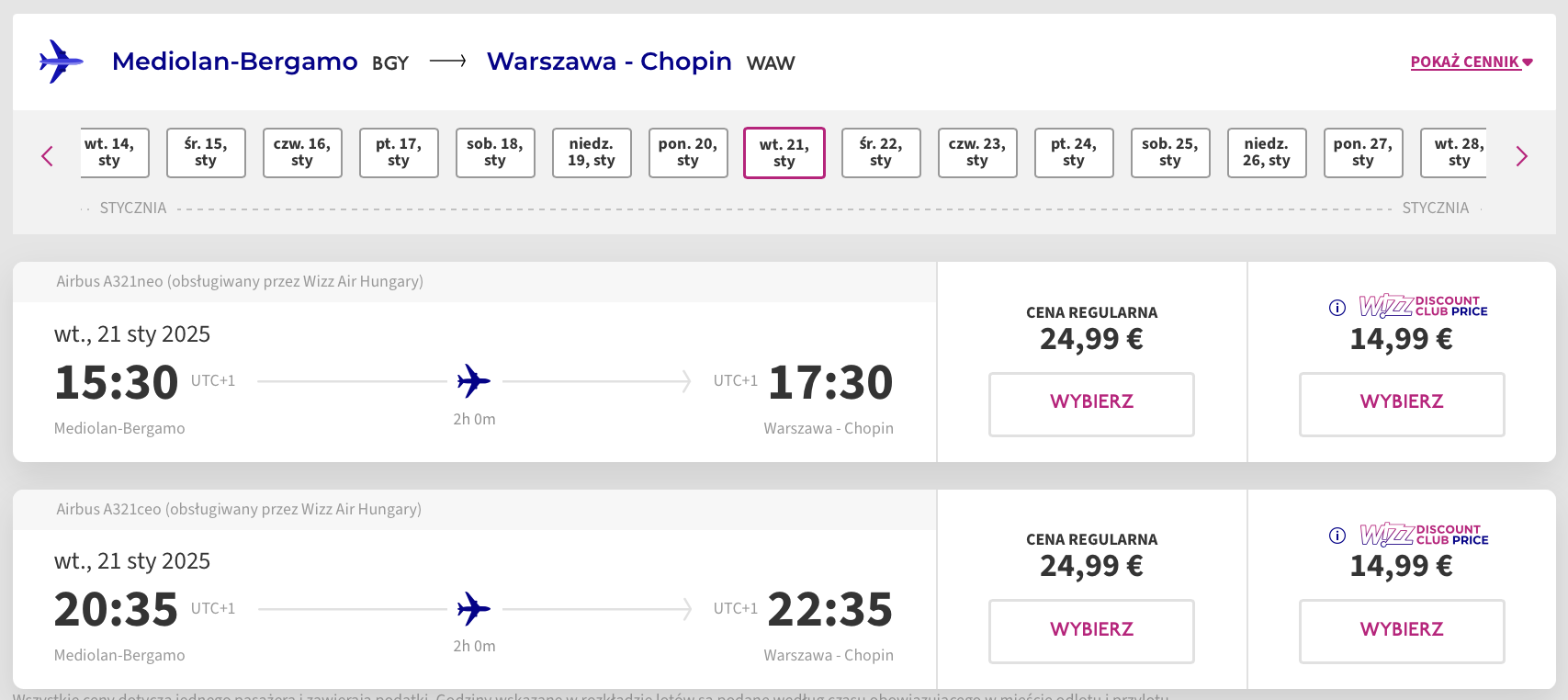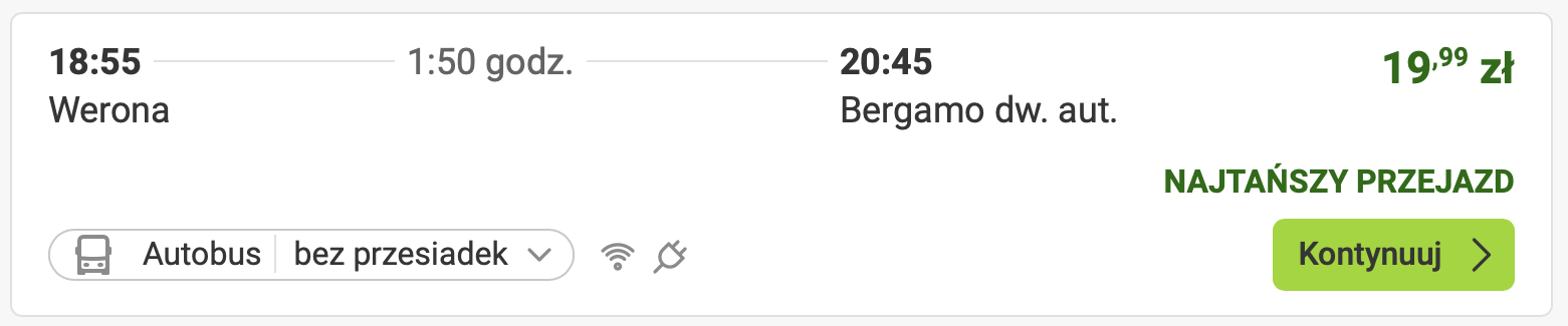 Do Werony polecisz z lotniska w Warszawie 18 stycznia. Kolejnego dnia udasz się wygodnym autokarem linii Flixbus do Bergamo. Po spędzeniu dwóch dni w mieście wrócisz do Warszawy (21 stycznia). W obie strony podróżować będziesz linią Wizz Air. W cenę biletów wliczony został bagaż podręczny.