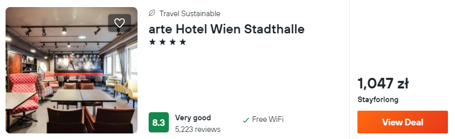 W Wiedniu wybrałam dla ciebie zakwaterowanie w 4* hotelu Arte Stadhalle. Dotychczasowi goście bardzo pozytywnie oceniają pobyt w tym miejscu.