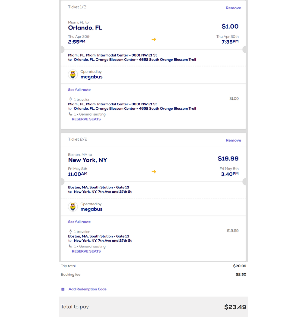 30 kwietnia pojedziecie autokarem firmy MegaBus z Miami do Orlando, a 8 maja z Bostonu do Nowego Jorku. Za oba przejazdy zapłacicie 23.49 USD (ok. 93 PLN). Widnieją one na jednej rezerwacji, aby nie płacić podwójnie opłaty za wystawienie biletu.