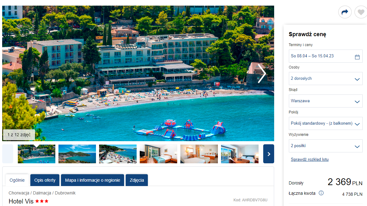 Urlop spędzisz w położonym tuż przy plaży 3* hotelu Vis. Dla gości przygotowano pokoje z widokiem na morze, bogate zaplecze sportowe oraz wyżywienie w postaci śniadań i obiadokolacji. W cenę pakietu wliczono także podróż z bagażem rejestrowanym, transfery lotniskowe, ubezpieczenie i opiekę rezydenta.