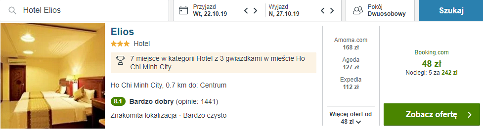 W Ho Chi Minh proponuję wam pobyt w hotelu Elios. Wybrałem go dla was ze względu na fakt, że leży w centrum miasta. To pozwoli wam na łatwy dostęp do większości lokalnych atrakcji. Pokoje są klimatyzowane i prosto urządzone. W każdym z nich znajduje się telewizor z dostępem do kanałów kablowych oraz łazienka z prysznicem.