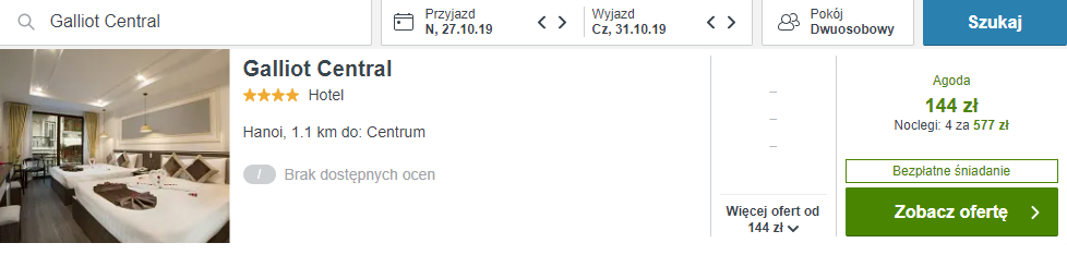 W Hanoi z kolei polecam wam zatrzymać się w 4* hotelu Galliot Central. Dzięki bliskiemu położeniu względem centrum miasta, będziecie mogli cieszyć się doskonałym dostępem do głównych atrakcji miasta. W hotelu czekają na was m.in. takie udogodnienia jak darmowe Wi-Fi we wszystkich pokojach, ochrona 24h czy codzienne sprzątanie. Cena zakwaterowania zawiera również codzienne śniadania.