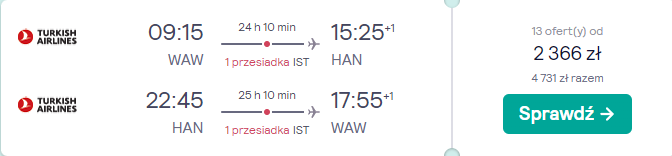 Do Wietnamu polecicie w terminie 7(8) – 15(16) listopada. W cenę biletów wliczony jest także bagaż rejestrowany – bez problemu zabierzecie ze sobą wszystkie najpotrzebniejsze rzeczy. Nie musicie się martwić o pogodę, rozpoczyna się wtedy pora sucha. Skorzystacie z usług przewoźnika Turkish Airlines.