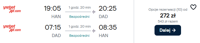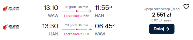 Do Wietnamu polecisz w dniach 4(5) – 13(14) marca. Najpierw zarezerwuj podróż z Warszawy do Hanoi z Air China. Po drodze przesiądziesz się w Pekinie. Na tym odcinku przysługuje ci bagaż rejestrowany.