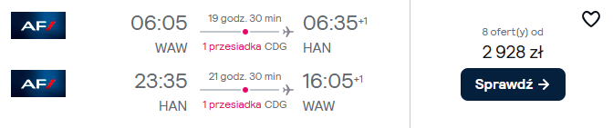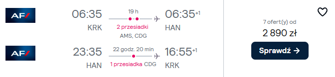 Na wycieczkę udasz się w terminie 31 maja – 30 czerwca(1 lipca). Zacznij od zarezerwowania „dalekich” lotów z Krakowa lub Warszawy do Hanoi. Polecisz tam z Air France i KLM z przesiadkami w Amsterdamie i Paryżu.
