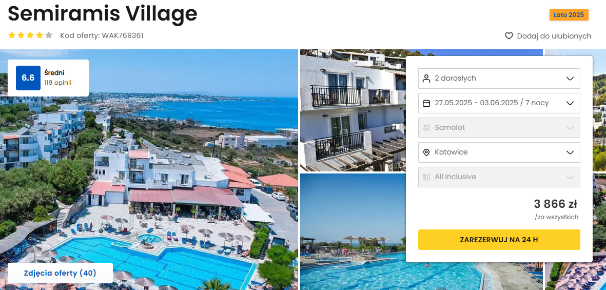 Na Kretę wybierzesz się w terminie 27 maja – 3 czerwca. Do Heraklionu polecisz z Katowic lub Warszawy. W cenę pakietu wliczone są transfery na trasie lotnisko – hotel – lotnisko, all inclusive i podstawowe ubezpieczenie.
