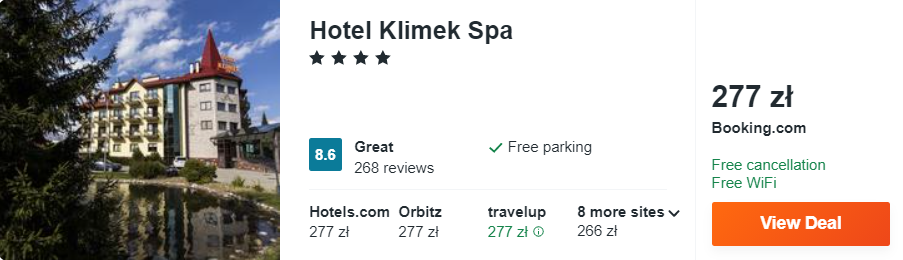 Dowiedzcie się więcej o tym hoteluTakże w Beskidzie Sądeckim znajduje się 4* hotel Klimek Spa, który położony jest w malowniczej dolinie, przy potoku Szczawnik. Na gości czeka tutaj darmowy parking, dostęp do sieci WiFi oraz kryty park wodny z sauną, łaźnią parową i prysznicami wysokociśnieniowymi.