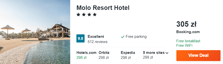 Dowiedzcie się więcej o tym hotelu4* Molo Resort Hotel oferuje swoim gościom prywatne molo, plaże oraz możliwość wypożyczenia sprzętu wodnego. W cenę zakwaterowania wliczone są codzienne śniadania, a za dodatkową opłatą będziecie mogli wynająć rowery. Hotel znajduje się w Osieku, w odległości nieco ponad 15 km od parku rozrywki Energylandia.