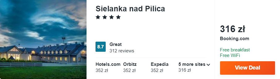 Dowiedzcie się więcej o tym hoteluOstanim obiektem na mojej liście jest znajdujący się w Warce 4* hotel Sielanka Nad Pilicą, który położony jest w malwoniczej okolicy nad rzeką o tej samej nazwie (Pilica). W trakcie pobytu będziecie mogli pograć w siatkówkę plażową, łowić ryby w stawie, jeździć konno lub uprawiać nordic walking – wypożyczalnia kijków dla hotelowych gości jest bezpłatna. W cenę zakwaterowania wliczone są codzienne śniadania oraz darmowy dostęp do sieci WiFi.