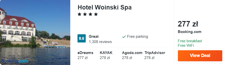 Dowiedzcie się więcej o tym hoteluNad samym jeziorem Lubiąż znajduje się 4* hotel Woiński Spa, który posiada prywatną plażę oraz molo. Na miejscu będziecie mogli wypożyczyć sprzęt do uprawiania sportów wodnych, a w cenę zakwaterowania wliczone są codzienne śniadania.