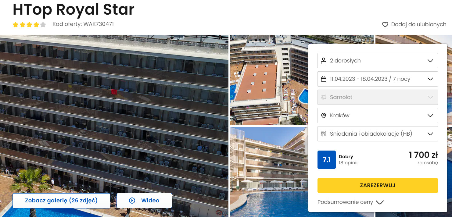 Na miejscu zatrzymasz się w 4* hotelu HTop Royal Star, który znajduje się w spokojnej części miasta Lloret de Mar, pomiędzy dwiema plażami: Fenals oraz Lloret de Mar. Na terenie obiektu mieszczą się dwa baseny (kryty i odkryty), strefa saun oraz jacuzzi. Każdy pokój wyposażony jest w klimatyzację z funkcją ogrzewania oraz telewizor LCD. W łazience jest wanna z prysznicem.