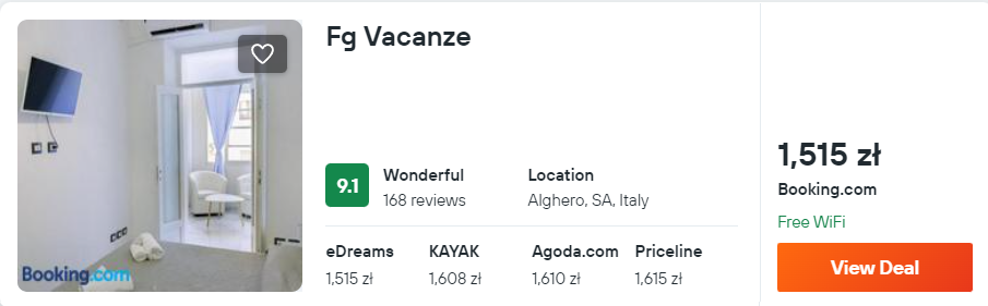 Na Sardynii rekomenduję pobyt w znakomicie ocenianym apartamencie Fg Vacanze, który położony jest w centrum miasta. Z lotniska dostaniesz się tam komunikacją publiczną lub wynajętym samochodem.