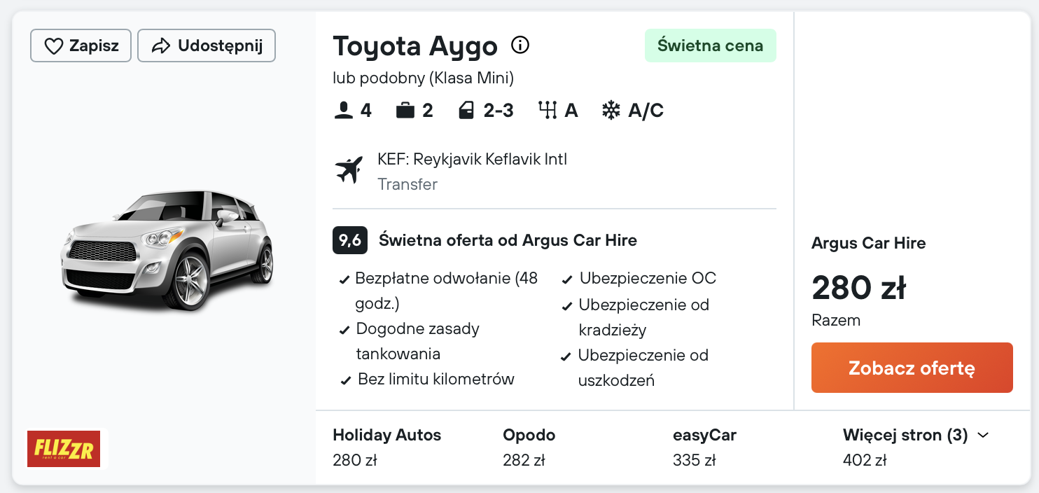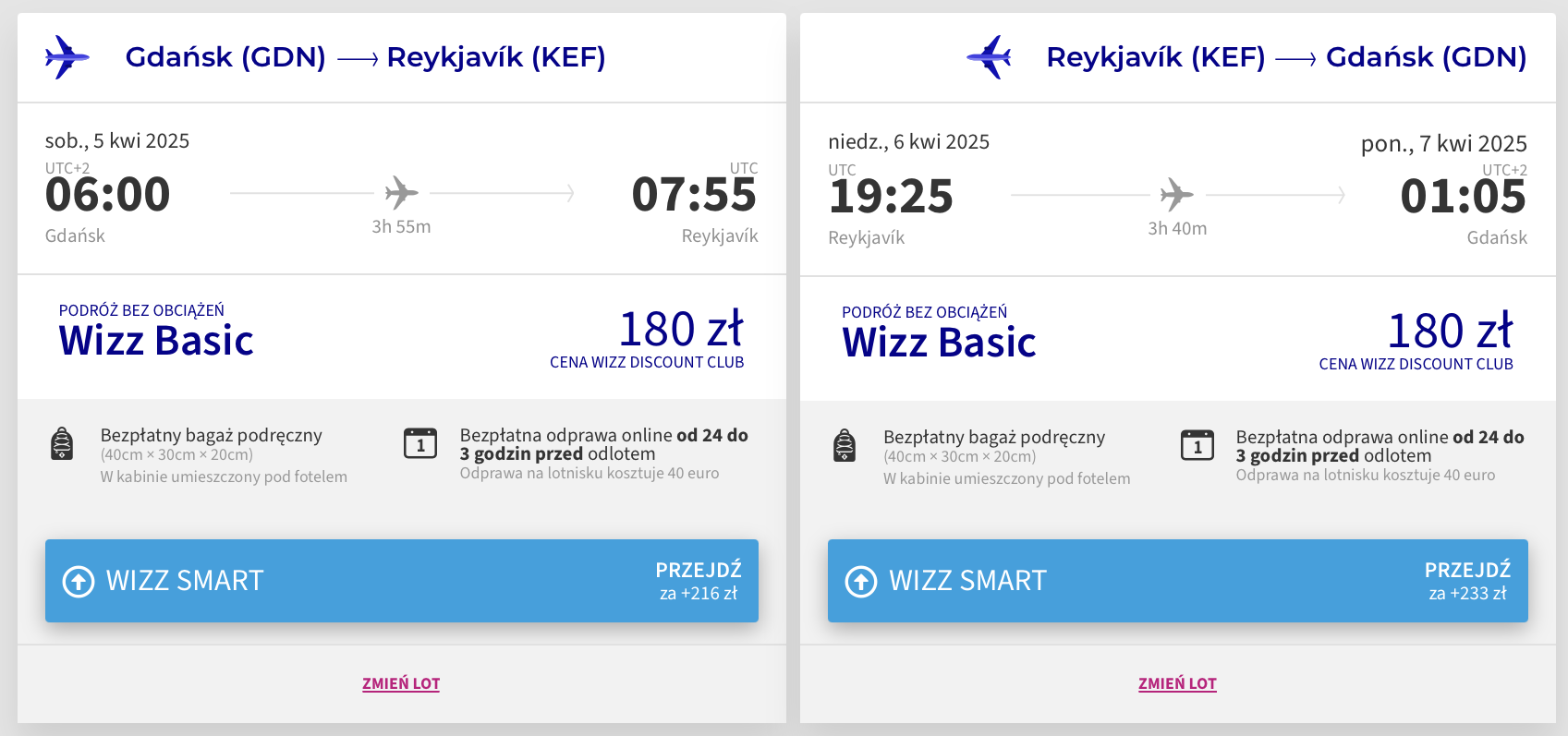 Na Islandię wybierzesz się z Gdańska w terminie 5-6 kwietnia (sobota-niedziela). W obie strony polecisz linią Wizz Air z bagażem podręcznym. Bilety w najniższej cenie dostępne są dla członków Wizz Discount Club. Chętni na loty bez WDC zapłacą nieco więcej.
