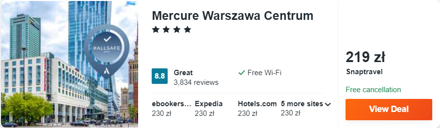 Dowiedzcie się więcej o tym hoteluW stolicy Polski polecam wam noclegi w fantastycznym 4* hotelu Mercure Warszawa Centrum, który położony jest w sercu miasta, w sąsiedztwie Pałacu Kultury i Nauki oraz centrum handlowego Złote Tarasy.