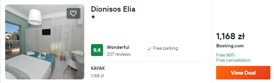 Proponuję zakwaterowanie w hotelu Dionisos Elia. Obiekt znajduje się w pobliżu plaży. Z lotniska do miejsca noclegowego dostaniesz się busem lub wypożyczonym samochodem.