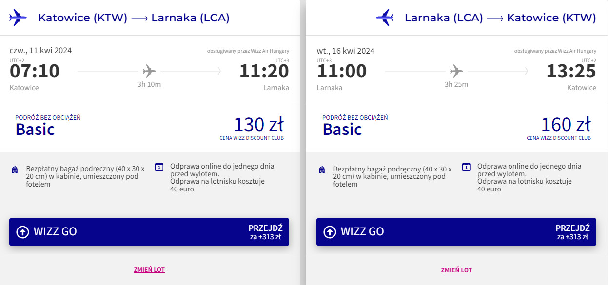 Do Larnaki udasz się z katowickiego lotniska w Pyrzowicach w kwietniu. W obie strony polecisz na pokładzie samolotu linii Wizz Air z wliczonym małym bagażem podręcznym. Bilety w najniższej cenie dostępne są dla członków Wizz Discount Club. Chętni na loty bez WDC zapłacą więcej.