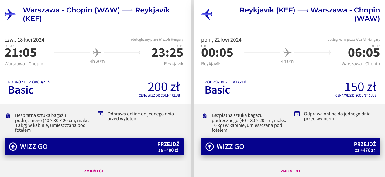 Do Reykjaviku wybierzesz się w terminie 18-22 kwietnia (czwartek-poniedziałek) na pokładach samolotów linii lotniczej Wizz Air. Twoja podróż rozpocznie się i zakończy na lotnisku im. Fryderyka Chopina w Warszawie. Bez dodatkowych kosztów będziesz mógł zabrać ze sobą bagaż podręczny.