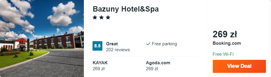 Dowiedzcie się więcej o tym hoteluPrzenosimy się na południe w sąsiedztwo Kaszubskiego Parku Krajobrazowego, gdzie mieści się bardzo dobry 3* hotel Bazuny&Spa. W cenę pobytu wliczony jest dostęp do sieci WiFi, sauny suchej i parowej. We wszystkich nowocześniej urządzony pokojach znajduje się łazienka z prysznicem, suszarką do włosów oraz podstawowymi przyborami toaletowymi.