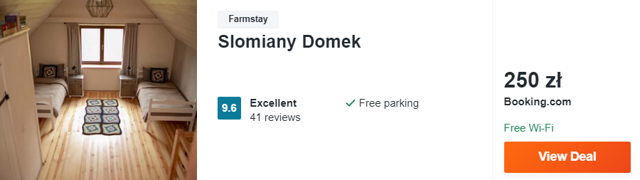 Dowiedzcie się więcej o tym hoteluPrzenosimy się w okolice jeziora Borzechowskiego, gdzie mieści się Słomiany Domek. Zatrzymując się tutaj do swojej dyspozycji będziecie mieli w pełni wyposażony aneks kuchenny, miejsce do relaksu, łazienkę oraz sypialnię. Na miejscu goście zapewniony mają darmowy parking, dostęp do sieci WiFi oraz bezpłatnie mogą wypożyczyć rower.