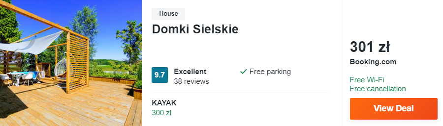 Dowiedzcie się więcej o tym hoteluNa zakończenie proponuję wam zakwaterownie w kompleksie Domki Sielskie, który znajduje się w Sławutowie, w odległości 21 km od Gdynii. Każdy z domków posiada w pełni wyposażony aneks kuchenny, łazienkę z prysznicem, miejsce do relasku i spania oraz patio z meblami ogrodowymi.