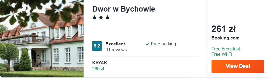 Dowiedzcie się więcej o tym hoteluKolejnym obiektem położonym w sąsiedztwie jezior (Żarnowieckim i Choczewskim), jest znakomity Dwór w Bychowie. Wszystkie tutejsze pokoje są urządzone w klasycznym stylu i wyposażone zostały w drewniane meble, w każdym mieści się łazienka z prysznicem. W cenę noclegu wliczone są codzienne śniadania.