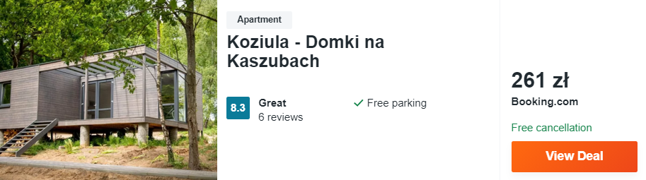 Dowiedzcie się więcej o tym hoteluW sercu Szwajcarii Kaszubskiej, pośród stawów, lasu i łąk znajduje się kompleks Koziula – Domki na Kaszubach. Każdy domek posiada w pełni wyposażony aneks kuchenny, sypialnię oraz łazienkę z prysznicem. Na miejscu za dodatkową opłatą będziecie mogli skorzystać z sauny fińskiej oraz z bali z gorącą wodą.