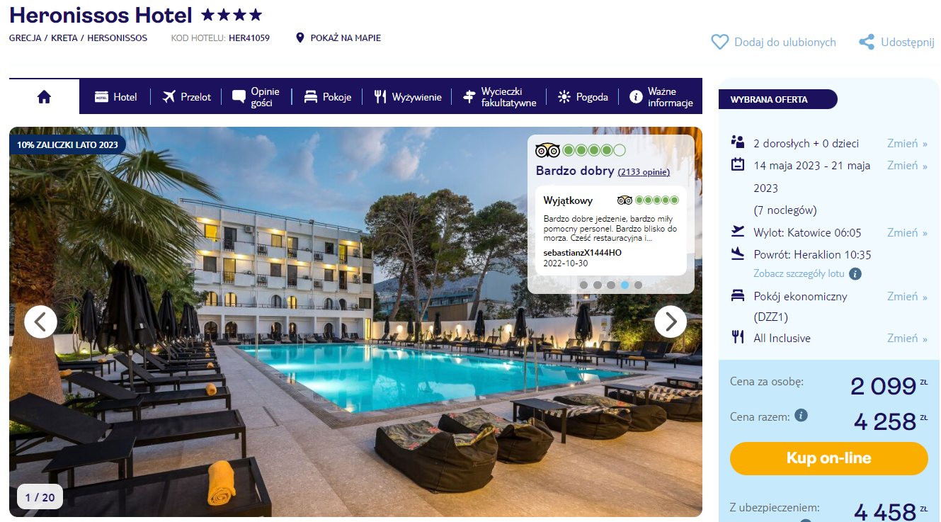 Do Grecji udasz się w terminie 14 – 21 maja. Czeka cię bezpośredni lot z Katowic, Warszawy, Gdańska, Wrocławia i Poznania do Heraklionu. W cenę wliczono bagaż podręczny i rejestrowany.
