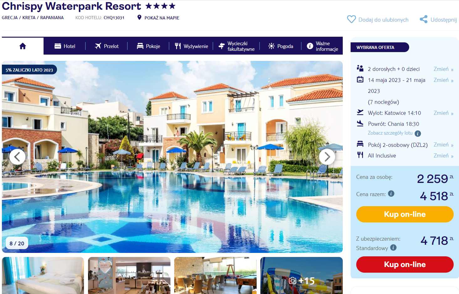 Do Grecji udasz się w terminie 14 – 21 maja. Czeka cię bezpośredni lot z Katowic, Warszawy i Poznania do Chanii. W cenę wliczono bagaż podręczny i rejestrowany.