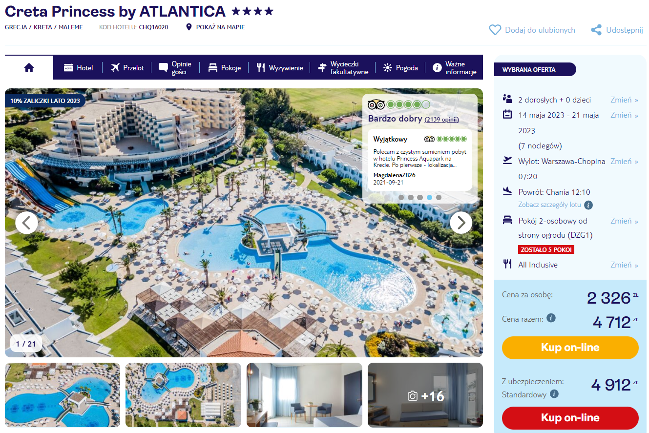 Do Grecji udasz się w terminie 14 – 21 maja. Czeka cię bezpośredni lot z Katowic, Warszawy i Poznania do Heraklionu. W cenę wliczono bagaż podręczny i rejestrowany.