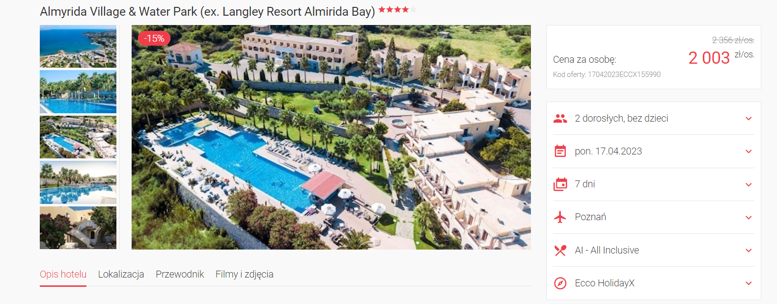 Wczasy spędzisz w 4* hotelu Almyrida Village & Water Park. Kompleks zlokalizowany jest w pobliżu plaży. Na terenie obiektu znajduje się taras słoneczny, baseny, strefa relaksu, siłownia i bogate zaplecze sportowe. W twoim pokoju znajdziesz TV, klimatyzację, komfortowe łóżko i prywatną łazienkę. W cenę pakietu wliczono wyżywienie w formule all inclusive.