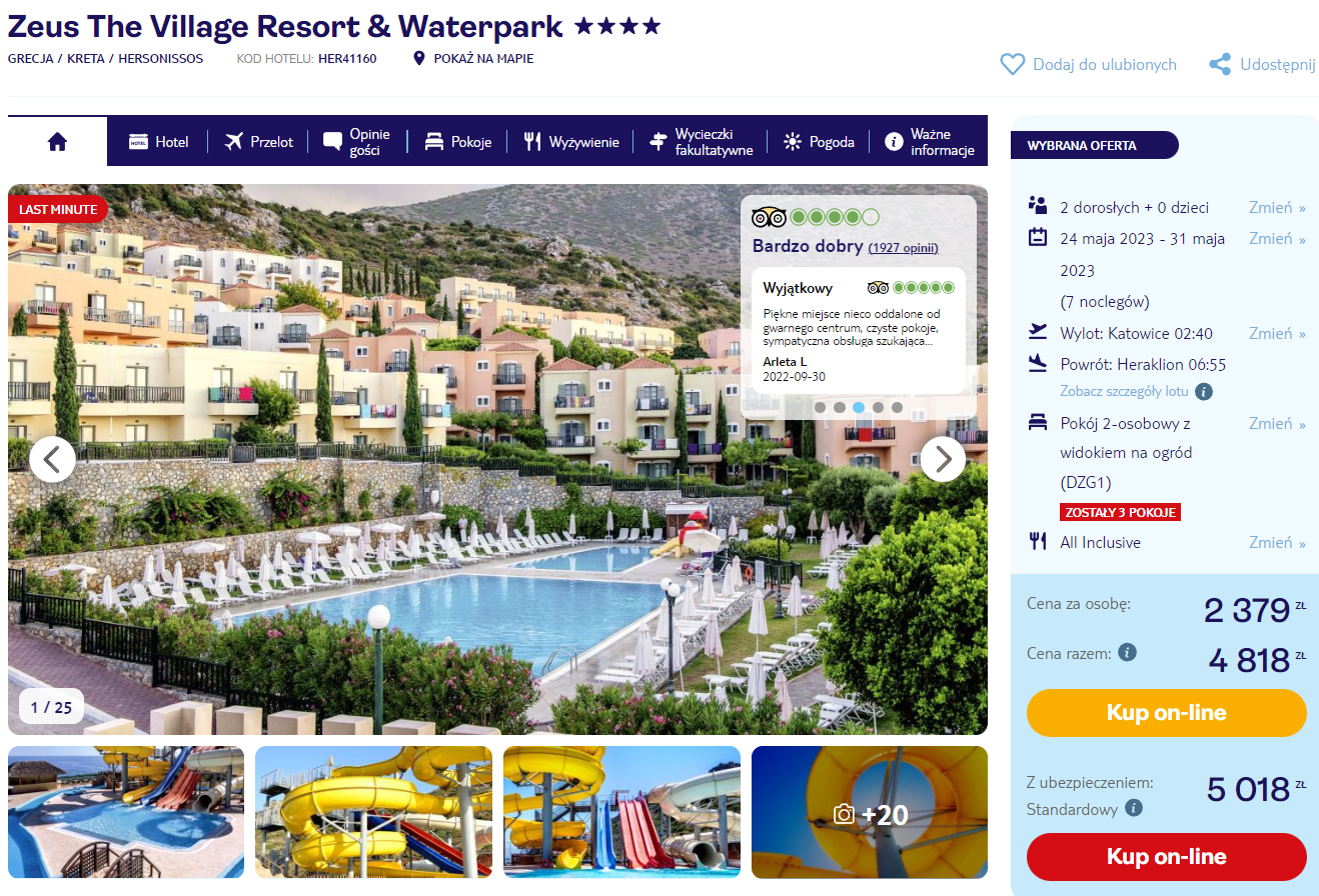 Na Krecie spędzisz tydzień w 4* hotelu Zeus The Village Resort & Waterpark. Do twojej dyspozycji zostanie oddany basen zewnętrzny z tarasem słonecznym, aquapark, siłownia oraz bogaty program rozrywkowy. Pokoje zostały nowocześnie urządzone i posiadają klimatyzację, TV, balkon i prywatną łazienkę.