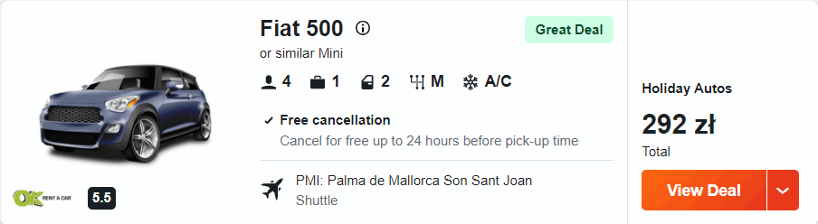 Wiosną ceny wypożyczenia samochodu na Majorce są bardzo atrakcyjne. Za wynajem Fiata 500 lub podobnego modelu zapłacicie tylko 48 PLN/doba.