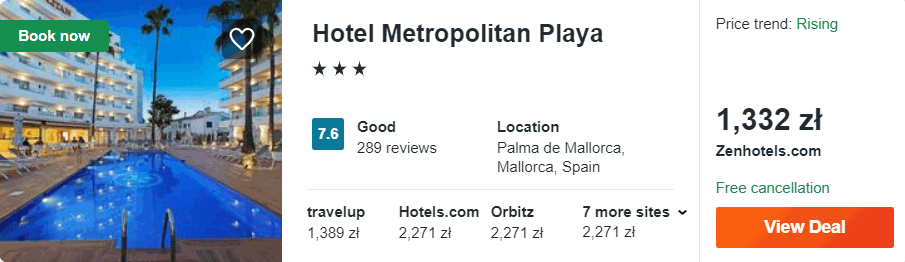 Na Majorce zakwaterowani będziecie w 3* hotelu Metropolitan Playa, który od plaży Playa de Palma oddalony jest o jedyne 500 metrów. Z lotniska w okolice miejsca noclegowego (przystanek 483-Balneari 8 – Can Salva) dojedziecie autobusem A2 za 5 EUR (ok. 23 PLN) lub wypożyczonym samochodem – szczegóły poniżej.