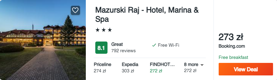 3* Mazurski Raj – Hotel, Marina & Spa położony jest nad samym jeziorem Bełdany, w otoczeniu 5 ha lasu. Do waszej dyspozycji będą funkcjonalnie urządzone pokoje z łazienką, telewizorem, telefonem i balkonem. W cenę pobytu wliczono smaczne śniadania.