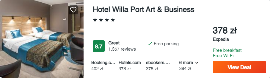 Na koniec proponuję wam pobyt w 4* hotelu Willa Port Art & Business, który znajduje się w Ostródzie. Obiekt wyróżnia się nowoczesnym wykończeniem wnętrz i oferuje komfortowe, klimatyzowane pokoje z dostępem do Wi-Fi. Co więcej, w cenę pobytu wliczono smaczne śniadania.