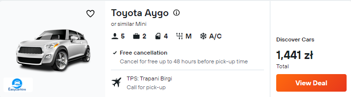 Aby szybko i wygodnie dostać się w okolice ciekawych miejsc – na przykład San Vito Lo Capo czy Castellammare del Golfo – warto mieć do swojej dyspozycji auto. Dlatego zachęcam cię do wypożyczenia samochodu zaraz po przylocie do Trapani.