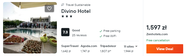W Trapani zatrzymasz się w hotelu Divino, który znajduje się poza centrum miasta, w otoczeniu winiarni. Z lotniska w okolice miejsca zakwaterowania dojedziesz komunikacją publiczną lub wypożyczonym samochodem – szczegóły znajdziesz poniżej.