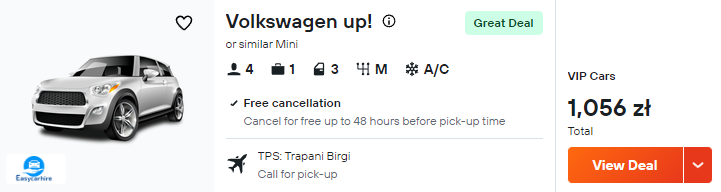 Aby szybko i wygodnie dostać się w okolice ciekawych miejsc – na przykład San Vito Lo Capo czy Castellammare del Golfo – warto mieć do swojej dyspozycji auto. Dlatego zachęcam cię do wypożyczenia samochodu zaraz po przylocie do Trapani.