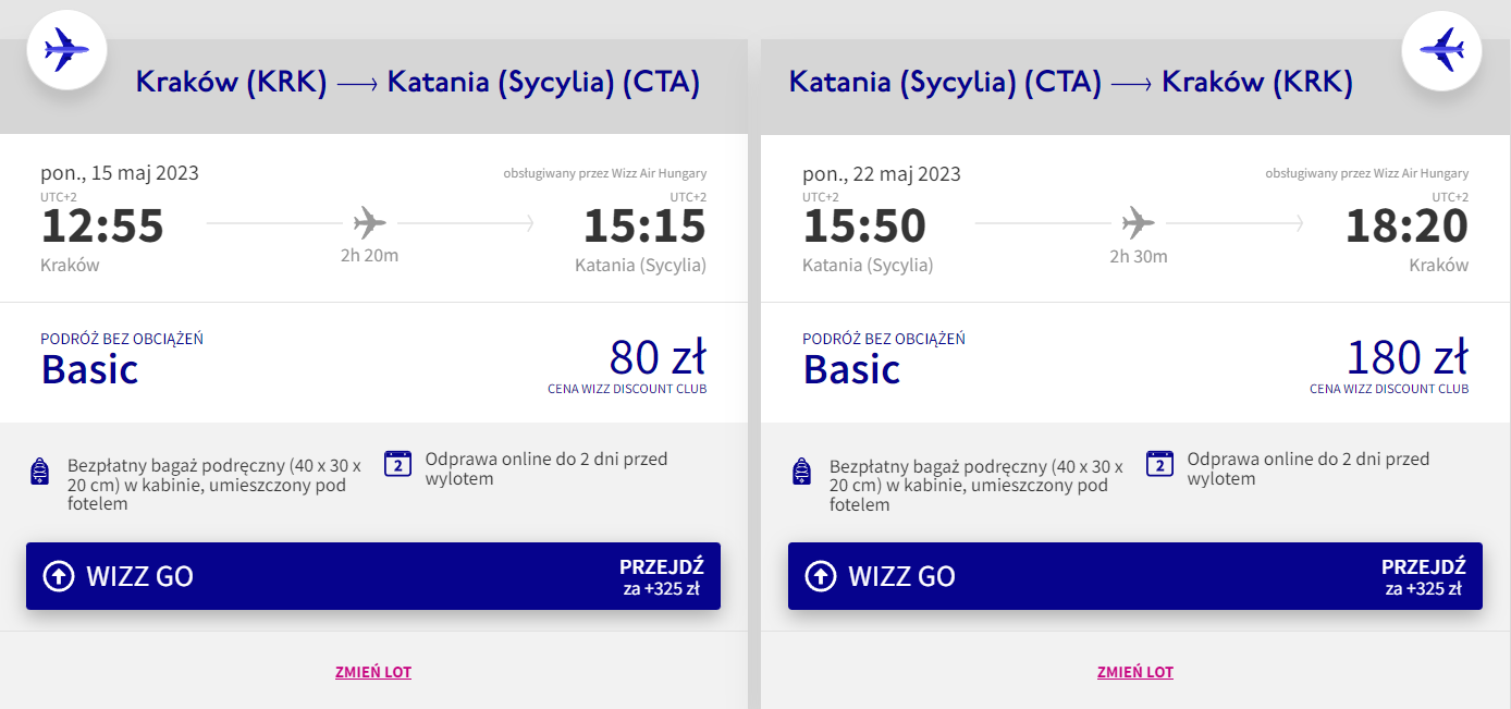 Do Włoch udasz się w terminie 15 – 22 maja. Czeka cię bezpośredni lot z Krakowa, realizowany na pokładach samolotów linii lotniczych Wizz Air. Bilety w najniższej cenie dostępne są dla członków Wizz Discount Club. Bez dodatkowych kosztów zabierzesz ze sobą mały bagaż podręczny.